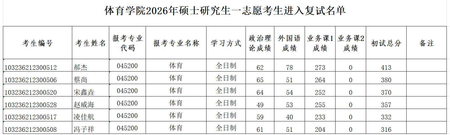 体育学院2026年硕士研究生一志愿考生进入复试名单